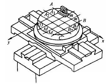 5、機(jī)床工作臺面的平面度檢驗方法如圖4所示,工作臺及床鞍分別置于行程的中間位置,在工作臺面上放一橋板,其上放水平儀,分別沿圖示各測量方向移動橋板,每隔橋板跨距d記錄一次水平儀讀數(shù)。通過工作臺面上A、B、D三點建立基準(zhǔn)平面,根據(jù)水平儀讀數(shù)求得各測點平面的坐標(biāo)值。