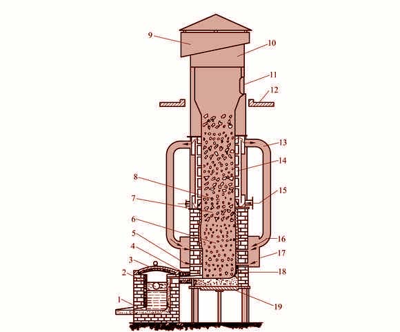 1—出鐵口 2—出渣口 3—前爐 4—過(guò)橋 5—風(fēng)口 6—底焦 7—金屬料 8—層焦 9—火花罩 10—煙囪 11—加料口 12—加料臺(tái) 13—熱風(fēng)管 14—熱風(fēng)膽 15—進(jìn)風(fēng)口 16—熱風(fēng) 17—風(fēng)帶 18—爐缸 19—爐底門(mén)